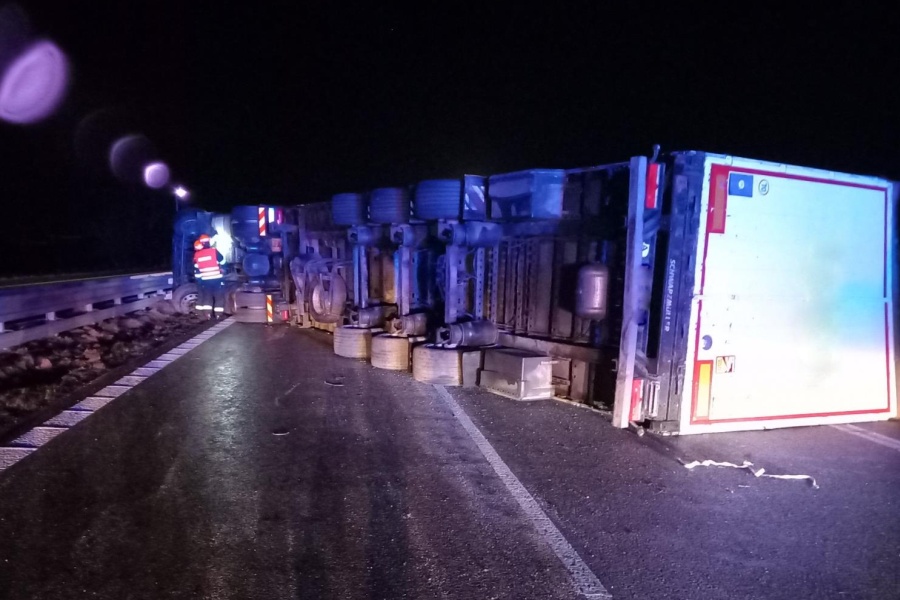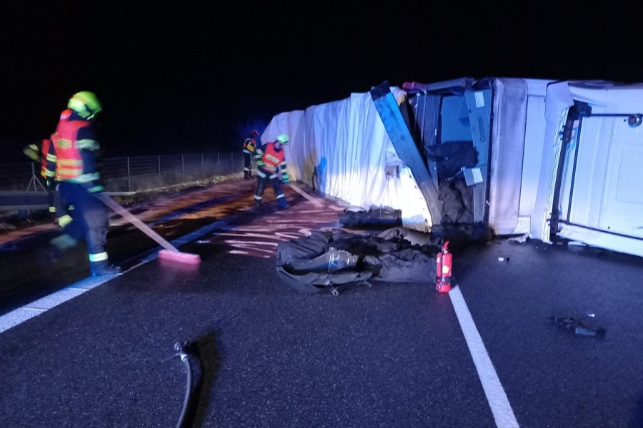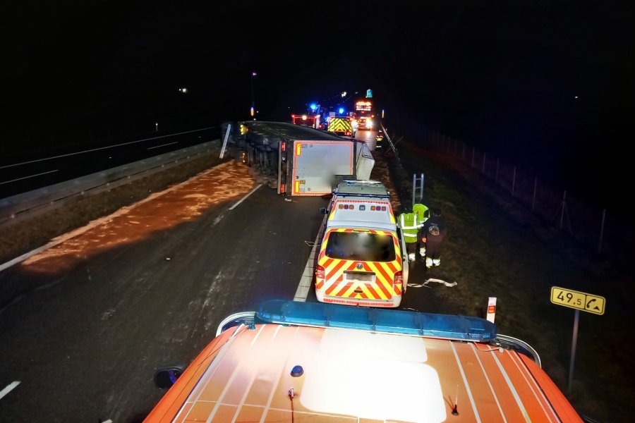 „Podle dosavadního šetření řidiče přemohla únava. Měl najet na krajnici a když procitnul, otočil soupravu na druhou stranu. Kamion se převrátil a zůstal ležet přes oba jízdní pruhy,“ informoval policejní mluvčí Petr Vala. Alkohol a drogy policisté u řidiče vyloučili.