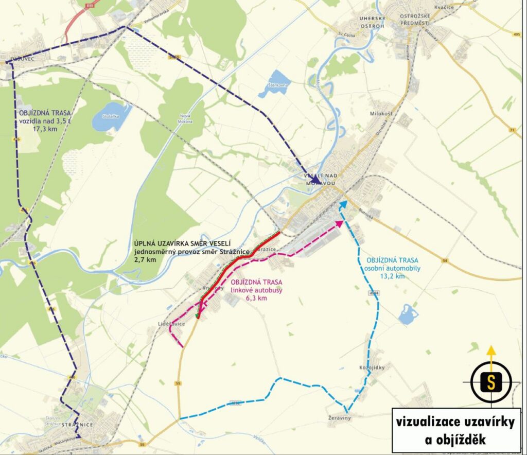 Silnice I/55 bude po celou dobu průjezdná v jednom směru do Strážnice. Tzn., že do Zarazic se dostanete z centra Veselí. Do části Zarazic (ul. Liškova, Vinohradská) se dostanete po silnici I/55 ulicí Crhounkova přes žel. přejezd Zarazice zastávka. Ze Zarazic do Veselí se dostanete přes areál Železáren. Objízdná trasa pro osobní automobily povede přes Kozojídky. Objízdná trasa pro nákladní dopravu povede přes Bzenec. Autobusy pojedou po místních komunikacích, kde bude dočasně zákaz zastavení.
