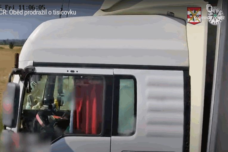 Řidič zahraničního kamionu si dopřál oběd za jízdy z talíře a na volantu
