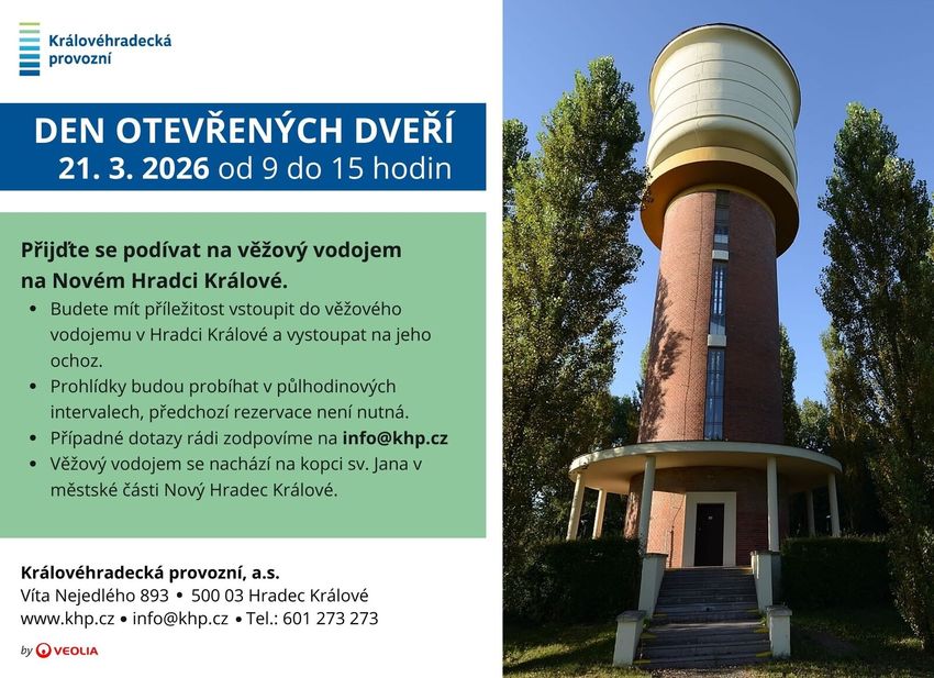 Zajímavou příležitost pro veřejnost připravila společnost Královéhradecká provozní, a.s. V sobotu 21. března od 9:00 do 15:00 hodin zpřístupní věžový vodojem na Novém Hradci Králové.