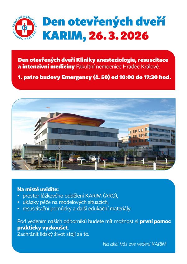 Klinika anesteziologie, resuscitace a intenzivní medicíny (KARIM) Fakultní nemocnice Hradec Králové připravila na čtvrtek 26. března 2026 Den otevřených dveří. Akce se uskuteční od 10:00 do 17:30 hodin v prvním patře budovy Emergency (č. 50).