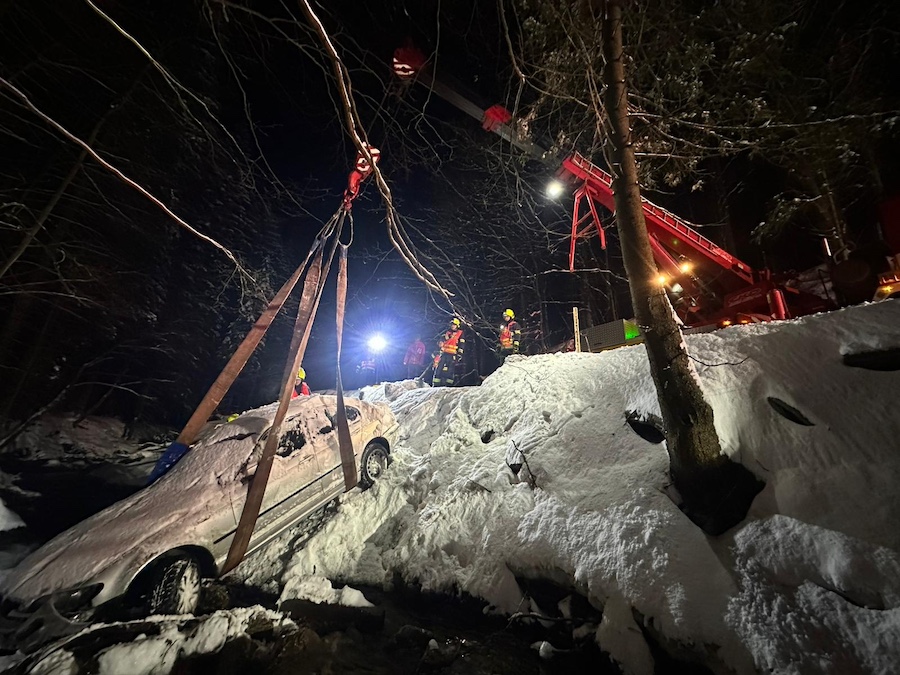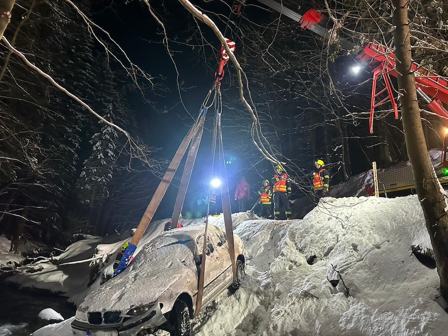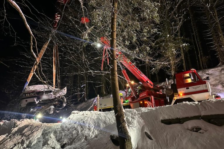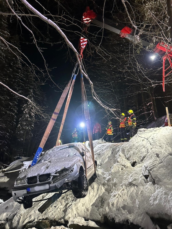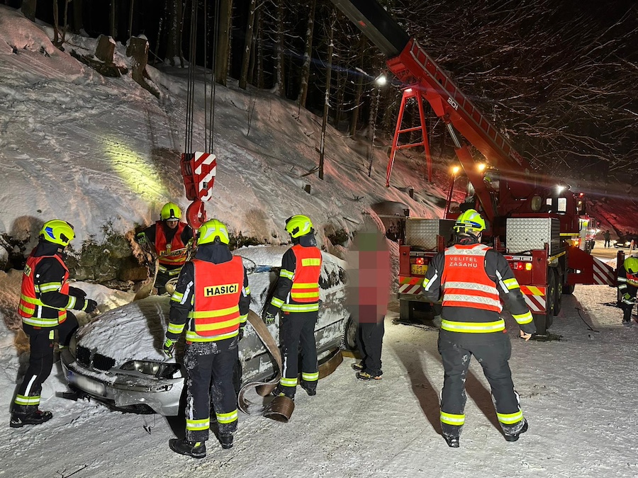 Událost byla na Krajské operační a informační středisko Hasičského záchranného sboru Libereckého kraje nahlášena krátce po 20. hodině. „Na místo byl vyslán vyprošťovací automobil dislokovaný na semilské stanici. Zasahující hasiči provedli protipožární opatření a následně zajistili vozidlo speciálními textilními popruhy, které zajistili na hák. Poté pomocí ramene jeřábu havarované auto již zapadané sněhem vyprostili z náročného terénu,“ popsala Benešová.