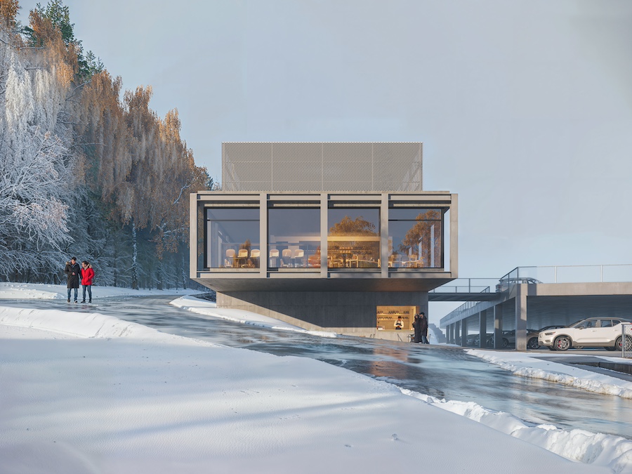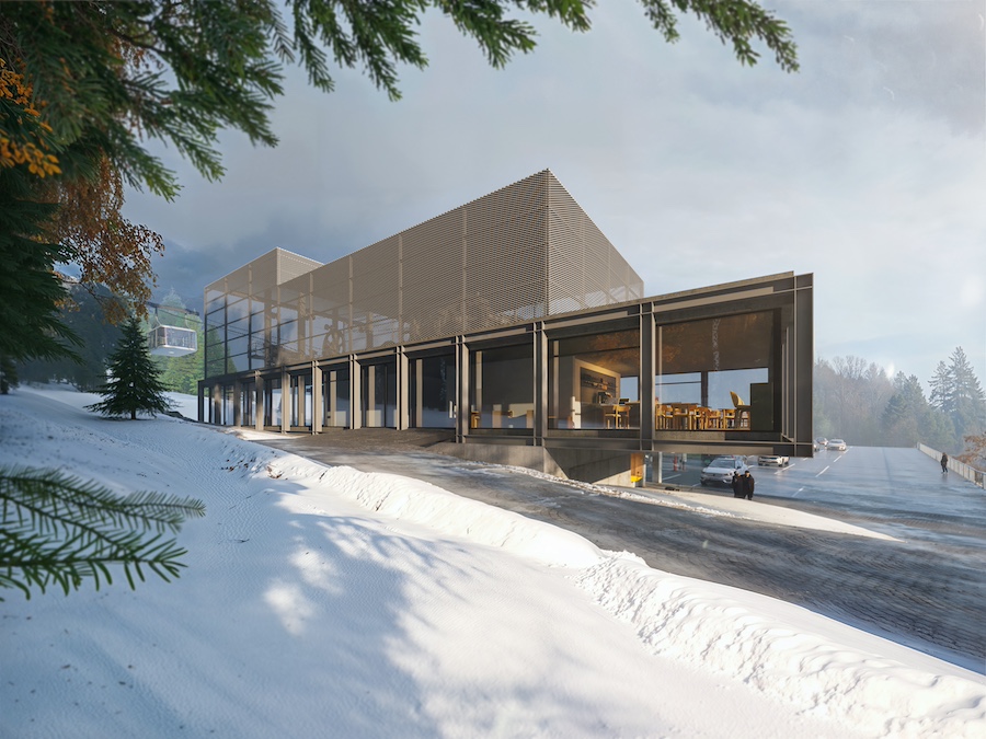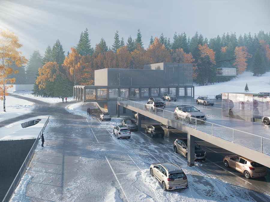 Lokalizace dolní stanice je v bezprostřední vazbě na stávající parkovací objekt. Návrh předpokládá provoz ve třech úrovních. Hlavní podlaží umožňuje přímý vstup a výstup na jižní straně od turistické trasy lesem i ze severu z nově navrhované úrovně parkovacího domu. „Toto podlaží zahrnuje vstupní a výstupní halu s prodejem jízdenek, prostor pro obsluhu, části pro cestující – vstupní i výstupní. Zároveň umisťujeme část pro drobný prodej včetně občerstvení s možností posezení. Součástí je komunikační propojení pro návštěvníky se spodním podlažím a technické schodiště obsluhy do horního podlaží technologie lanové dráhy a nezbytného servisu,“ popisuje Jiří Buček ze studia SIAL architekti a inženýři.