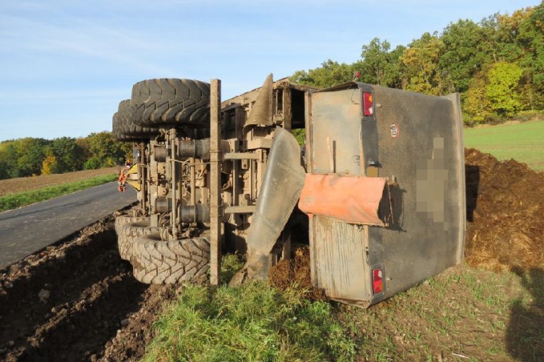 Řidiči se vymstil nezpevněný okraj komunikace a převážený hnůj tak skončil v poli