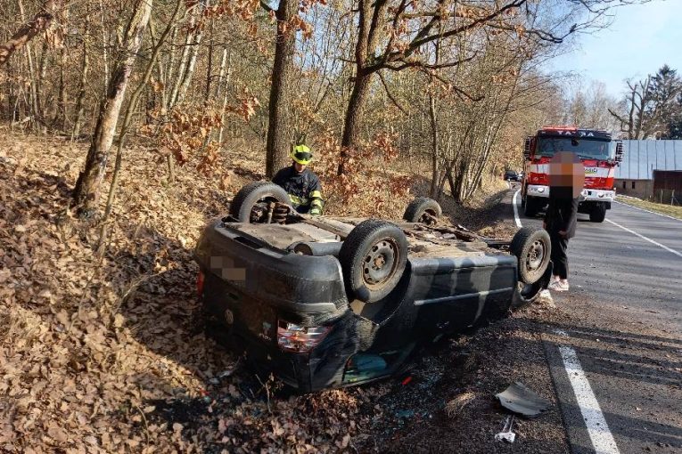 Hasiči měli napilno: Převrácené auto, čelní střet i zraněný řidič