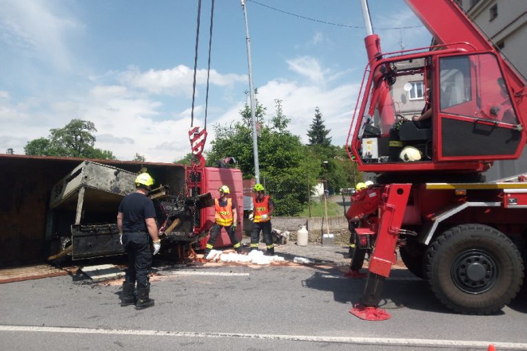 Převrácený nákladní vůz zablokoval silnici v Červeném Kostelci