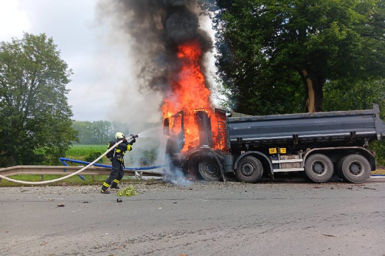 Náklaďák narazil do svodidel a začal hořet