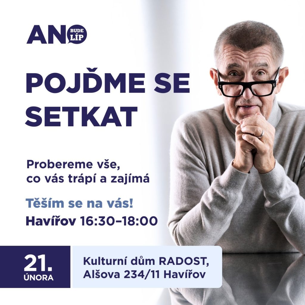 Politik se s havířovskými setká v pátek 21. února od 16:30 do 18:00 v Kulturním domě Radost. Vratimov Babiš navštíví v úterý 25. února opět od 16:30 do 18:00 s ním lidé mohou debatovat v Kulturním středisku v ulici Frýdecká 1000/48. Do Krnova pak známý politik zavítá ve čtvrtek 27. února v čase od 17:00 do 19:00. Setkání se uskuteční v Sále Kos v ulici Stará Ježnická 1556/1. Babiš slibuje, že na setkíních s lidmi probere vše, co je trápí a zajímá.
