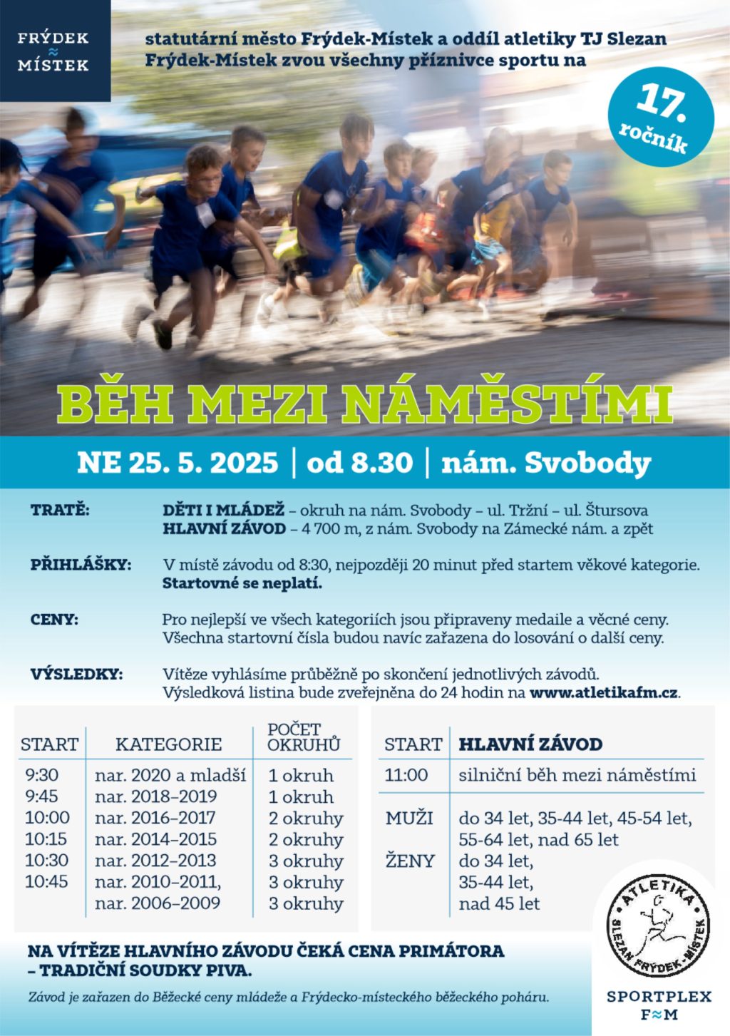 Uskuteční se v neděli 25. května. Na 17. ročníku oblíbené sportovní akce si zaběhají opravdu všichni. Pořadatelé připravili tratě pro všechny věkové kategorie – od nejmenších dětí po dospělé. „Cením si každého, malého či velkého účastníka, který si přijde zaběhat. Pro vítěze hlavního závodu mám připravené soudky piva. Nenechte si ujít tuto oblíbenou akci,“ zve primátor Ftýdku-Místku Petr
