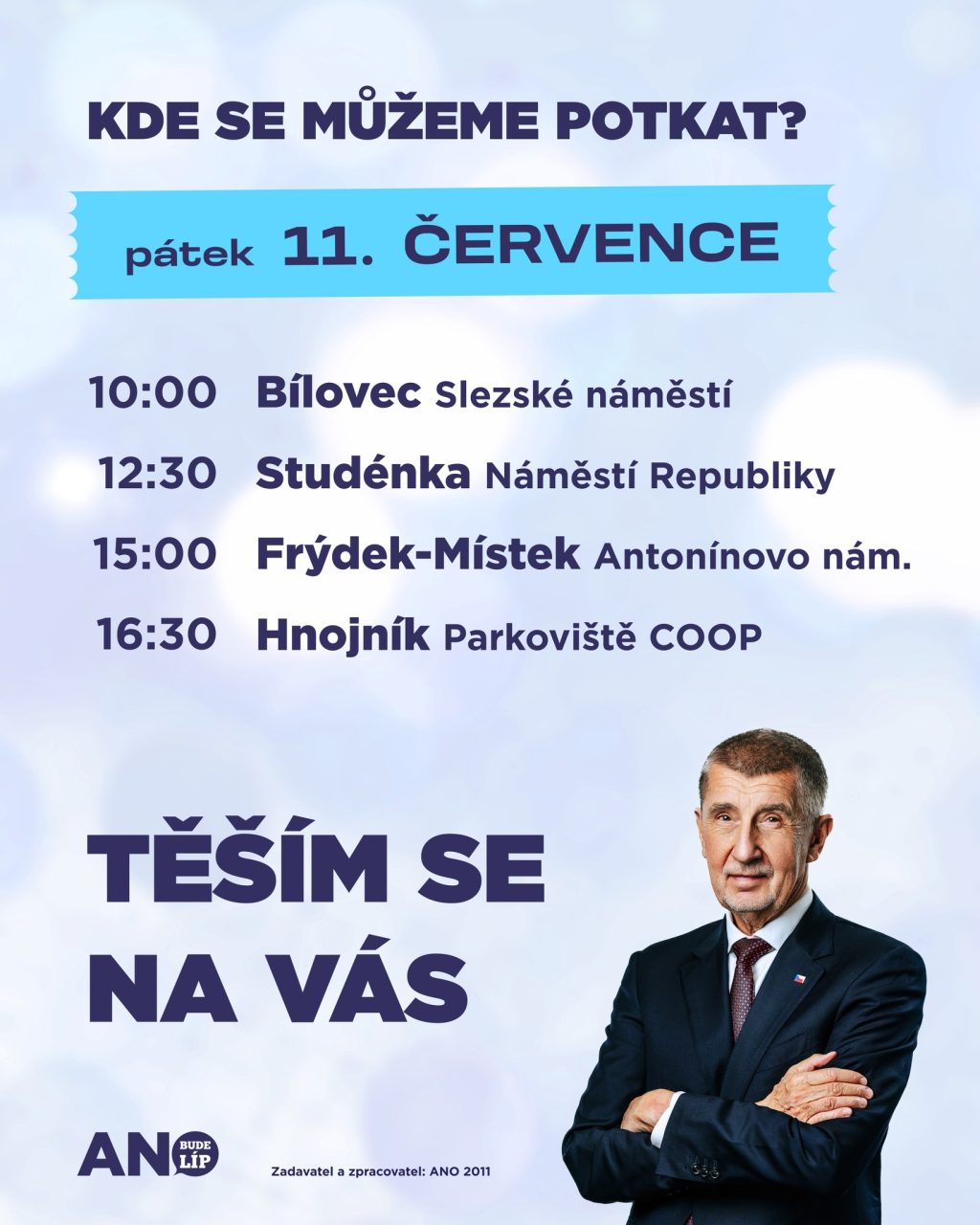 S politikem se lidé mohou v pátek 11. července setkat hned na 4 místech. Diskuze započne v 10:00 v Bílovci na Slezském náměstí, ve 12:30 čeká Babiše debata s lidmi ze Studénky na náměstí republiky. Ve Frýdku-Místku bude na Antonínově náměstí od 15:00. Den zakončí v 16:30 v Hnojníku na parkovišti COOP. “ Tak se pojďme setkat,“ zve politik na svých sociálních sítích.
