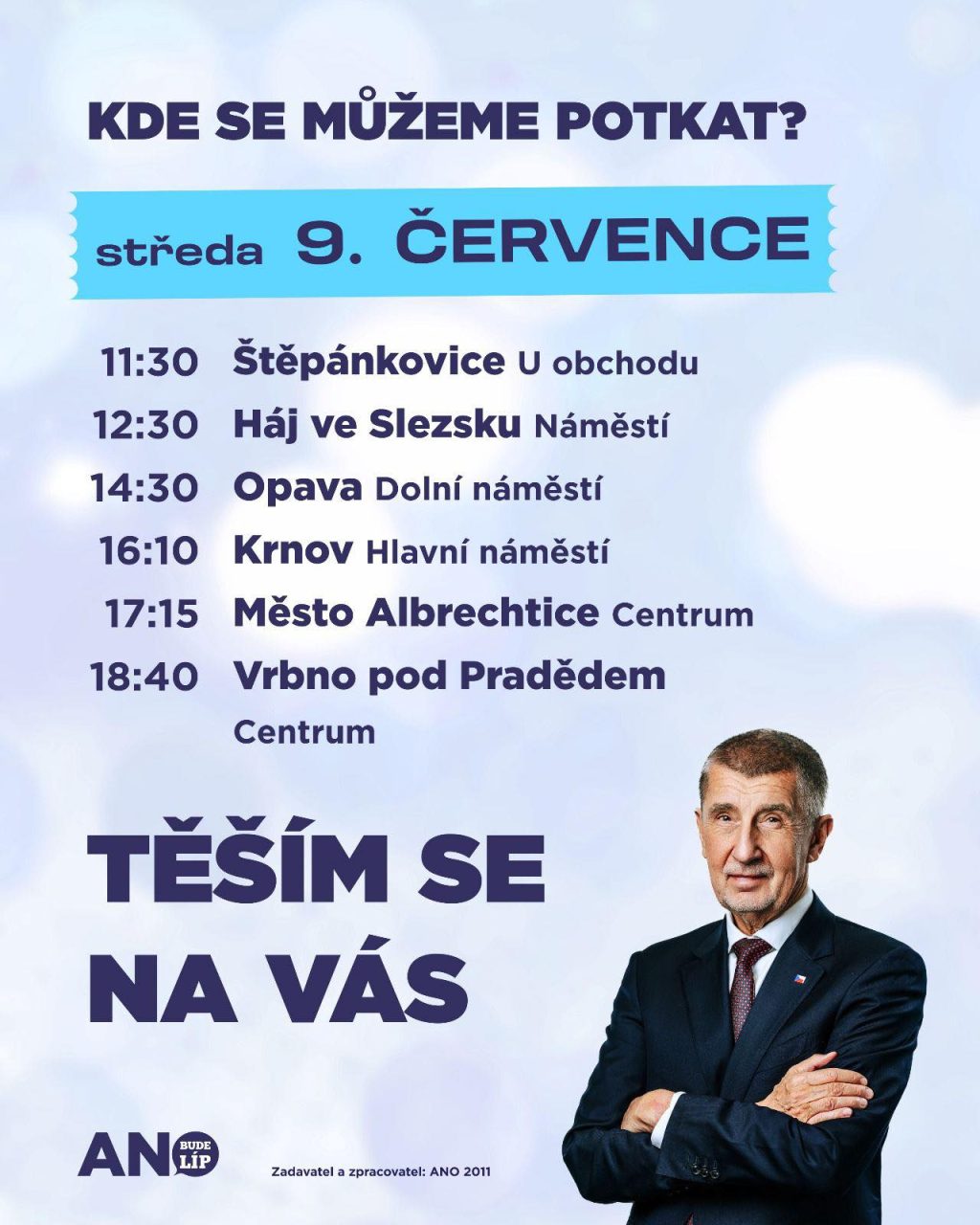 O den později, tedy 10. července bude Babiš ve Vratimově, kde začíná od 10:00 na Radničním náměstí, v Petřkovicích bude ve 12:30 na místním náměstí. Cestu zakončí od 17:30 v Karviné na Masarykově náměstí.