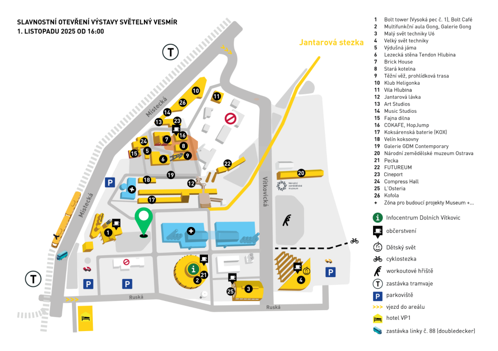K vidění bude od 1. listopadu do 31. prosince v čase od 16:00 do 21:00 na adrese Areál Dolní oblast Vítkovice, Ruská 2993, Ostrava. Areál, jenž je symbolem ostravské historie i přeměny města, se už potřetí každý den po setmění rozzáří půl milionem světýlek a vytvoří jedinečné spojení drsné industriální architektury s poezií světla a hloubkou Vesmíru. „Do veřejného prostoru vstupujeme se světlem citlivě a kultivovaně. Nechceme vytvářet světelný smog, ale navazovat s návštěvníky dialog. Výstavou nechceme jen vyprávět, ale i přinést poučení a radost,“ uvedla majitelka společnosti DECOLED Eva Poláčková, která stojí za realizací expozice. Návštěvníci se vydají na cestu mezi planetami sluneční soustavy, nahlédnou do černých děr a objeví kouzlo souhvězdí. Každý krok přináší nové příběhy Vesmíru v prostředí, které samo o sobě vypráví příběh lidské vynalézavosti a práce.
