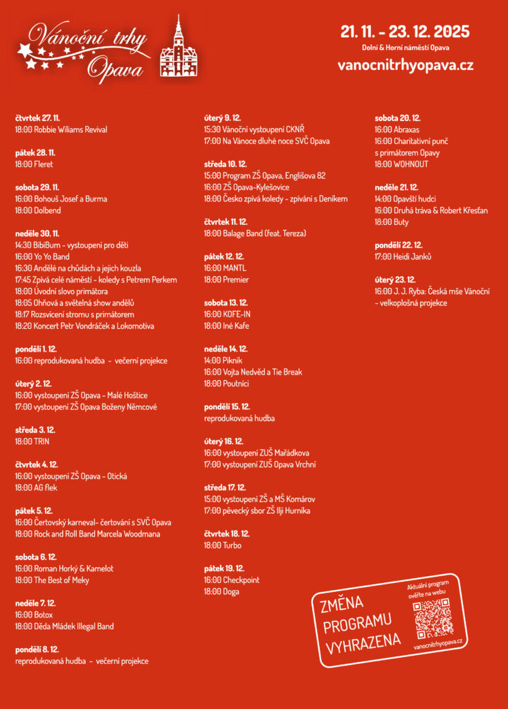 Trhy jako takové odstartují již 21. listopadu a potrvají až do 23. prosince. Návštěvníci se dále mohou těšit na vystoupení Vypsaná Fixy, Buty, Heidi Janků, Premieru, Horkýže Slíže či Fleretu, umělců bude samozřejmě daleko více. „Nebude chybět oblíbená vyhlídka, ze které můžete sledovat dění na pódiu i celém náměstí, nebo atrakce pro děti, které na Horním náměstí mohou z Ježíškovy pošty odeslat dopis se svými přáními,“ láká město Opava na svých webových stránkách.