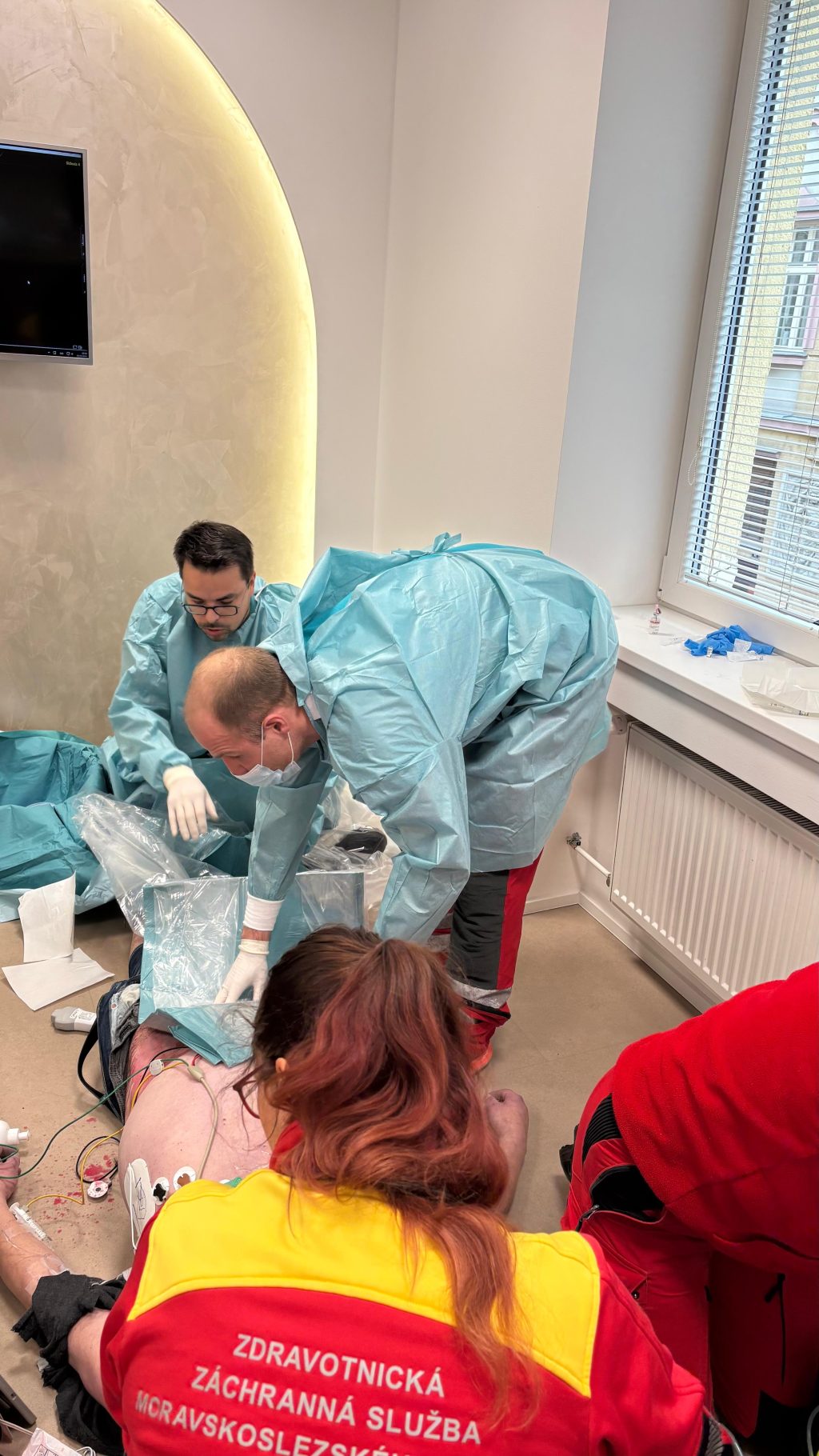 Dispečer Zdravotnické záchranné služby Moravskoslezského kraje, který vyslal posádku, zároveň informoval ECMO tým FN Ostrava. „Mobilní telefon zazvonil mně, sestře i řidiči sanity a během chvilky jsme společně vyrazili do přibližně 12 kilometrů vzdálené ordinace. Na místě jsme muže za nepřetržité resuscitace napojili na mimotělní krevní oběh a transportovali ho k nám do nemocnice, kde už byl připraven kardiologický tým,“ popsal výjezd jeden ze dvou zasahujících lékařů Michal Frelich. Od momentu srdeční zástavy po napojení pacienta na ECMO uběhlo pouhých 45 minut.