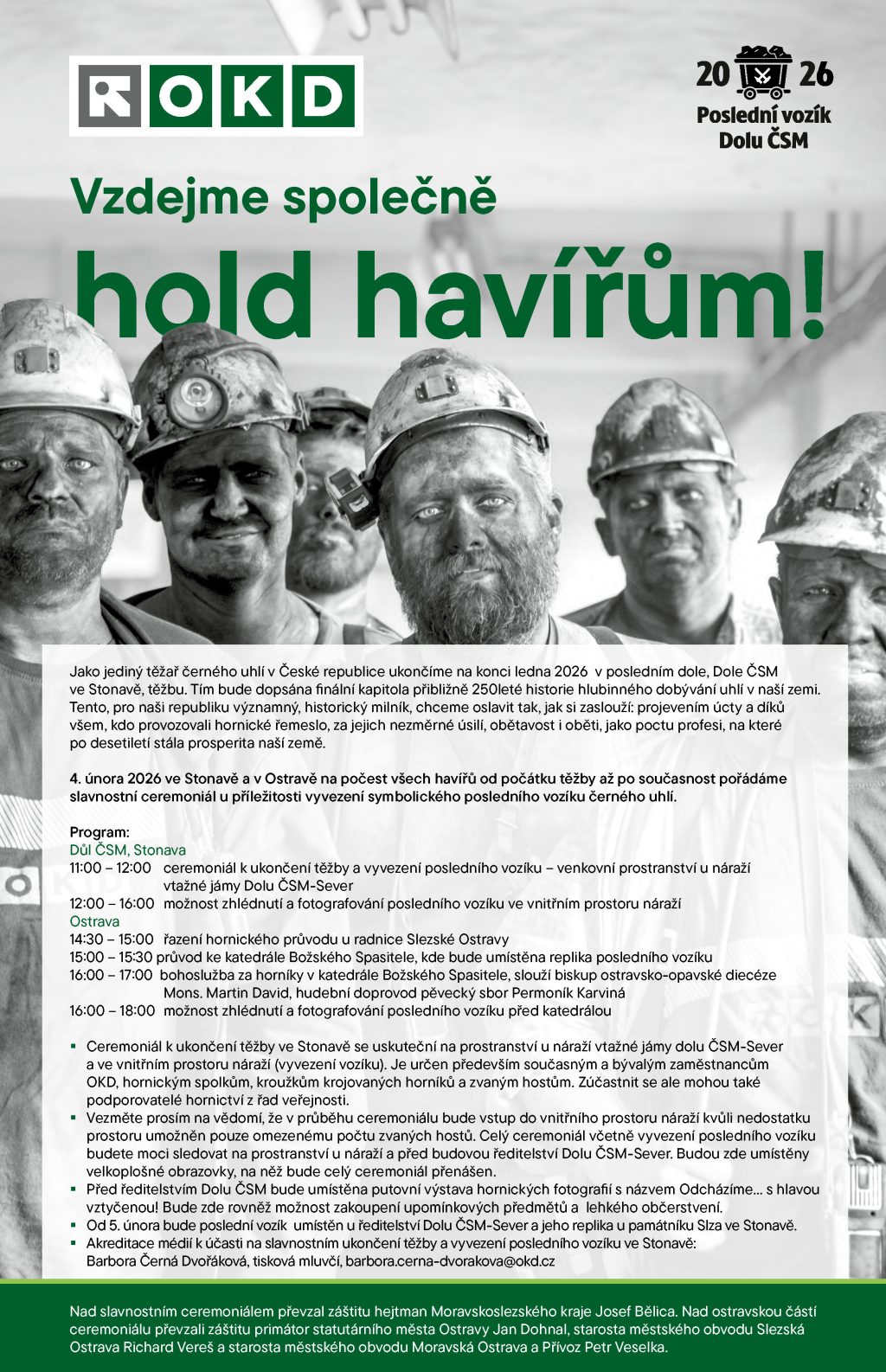 Symbolický poslední vozík uhlí vyjede 4. února z hloubky 1 300 metrů, čímž bude těžba černého uhlí v České republice po téměř 250 letech ukončena. Hold havířům může v tento den přijít vzdát také veřejnost. Připravený je bohatý program. Návštěvníci se mohou například těšit na slavnostní vyvezení posledního vozíku na Dole ČSM-Sever ve Stonavě, velký hornický průvod Ostravou, bohoslužbu za horníky v katedrále Božského Spasitele v Ostravě.