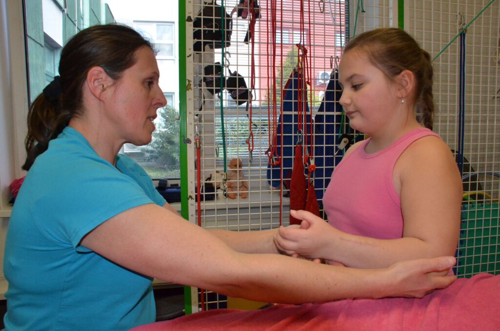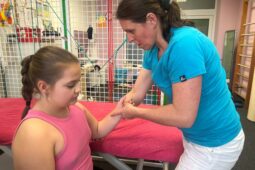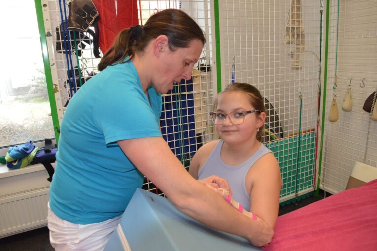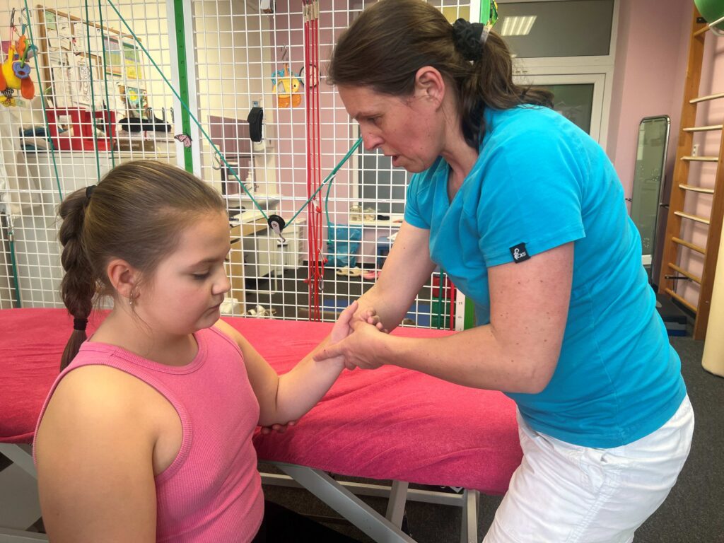 Do Klimkovic jezdí Markétka už od dvou let, obvykle dvakrát ročně, letos je tady už pošestnácté. Lázeňská léčba pro ni znamená dlouhodobou šanci, jak ruku zapojit do běžných činností – od oblékání a hygieny až po psaní nebo práci ve škole. Vedle komplexní lázeňské péče nyní absolvuje také intenzivní program, který rozšiřuje běžnou rehabilitaci o delší a cílenou individuální terapii. Zatímco standardní cvičení trvá půl hodiny, v rámci programu pracuje s fyzioterapeutkou denně hodinu a půl. „Delší čas nám umožňuje nejprve uvolnit přetížené svaly a tkáně v oblasti zad, šíje a ramene a teprve potom se naplno věnovat samotné ruce. U Markétky tak pracujeme nejen na konkrétním pohybu, ale i na stabilitě a držení celého těla,“ vysvětluje fyzioterapeutka Markéta Majková.