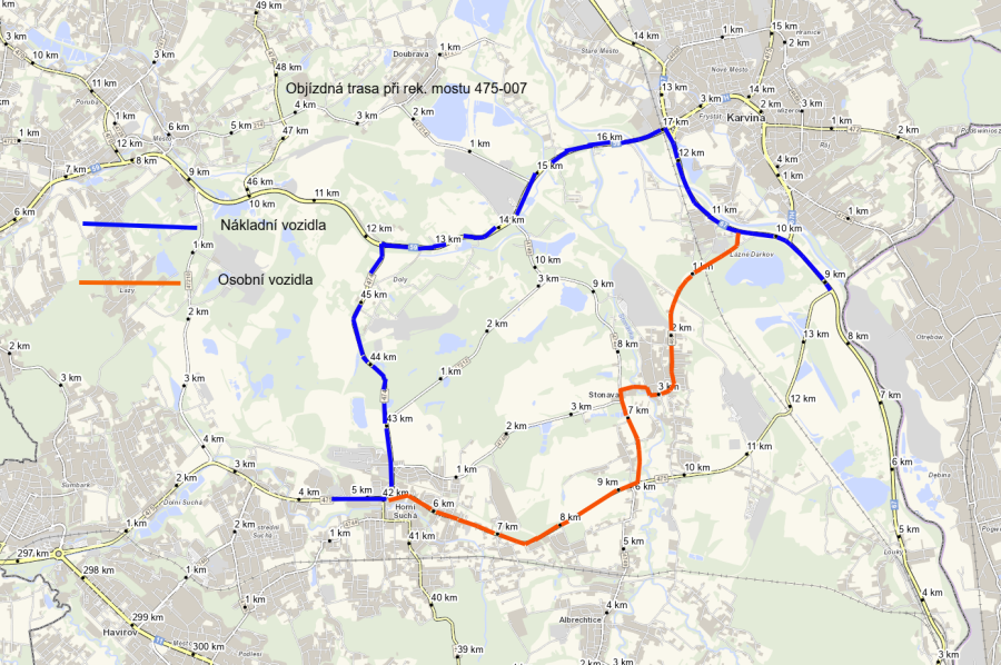 Objízdná trasa: Stonava, sídliště Hořany – Hořany – PZKO – III/4687 – III/4749 – Stonava, rozc. Albrechtice.