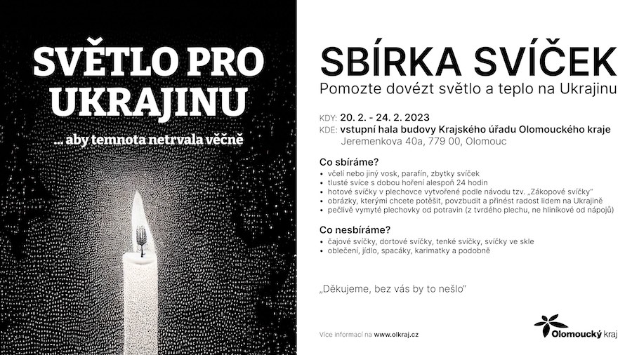 Svíčky mohou lidé nosit do budovy Krajského úřadu Olomouckého kraje naproti vlakovému nádraží v Olomouci do pátku 24. února. Nehodí se svíčky čajové, dortové, tenké nebo ty ve skle. Dobrovolníci nejlépe využijí svíce s širším objemem. Nosit můžete také pečlivě vymyté plechovky od potravin z tvrdého plechu například od hrášku, rajčat či fazolí.