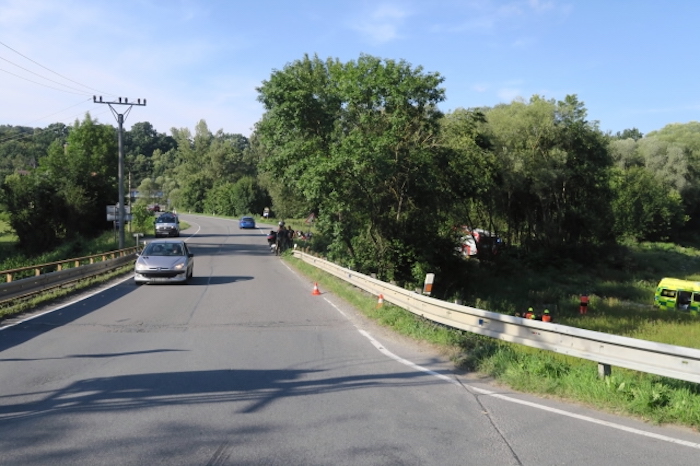 Nešťastná nehoda se stala v neděli odpoledne u Ústí na Hranicku. 68letý muž jel na motorce Honda od Opatovic na Hranice. V levotočivé zatáčce najel na štěrk, dostal smyk a ztratil kontrolu nad řízením “Na mostě narazil do kovových svodidel, přes která přepadl a dopadl na zatravněný terén pod mostem,” popsala nehodu policejní mluvčí Miluše Zajícová. Motorka zůstala ležet na silnici. Dechová zkouška u motorkáře nemohla být z důvodu zranění provedena, proto byl nařízen odběr krve v nemocnici. Do Fakultní nemocnice Olomouc ho přepravil vrtulník.
