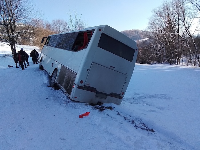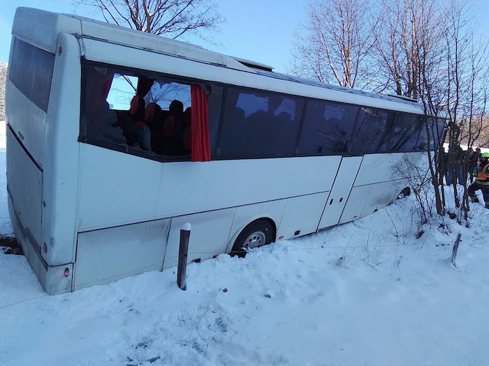 Hasiči včera zasahovali u nehody zájezdového autobusu, který na namrzlé silnici u Rejchartic na Šumpersku sjel do příkopu, kam se částečně převrátil tak, že nebylo možné otevřít žádné veře. Cestovalo v něm 49 studentů, 3 pedagogové a řidič. „Jelikož hrozilo převrácení vozu, cestující rozbili okna, vytvořili si tak únikové cesty a postupně se dostali ven před příjezdem jednotek,“ popsala mluvčí hasičů Lucie Balážová. Při kolizi se dva studenti zranili, těm hasiči poskytli první pomoc a předali je záchranářům, kteří je přepravili do nemocnice. Hasiči potom likvidovali uniklé provozní kapaliny a na místo povolali sypač, aby mohl přijet náhradní přepravce a vyprošťovací technika.