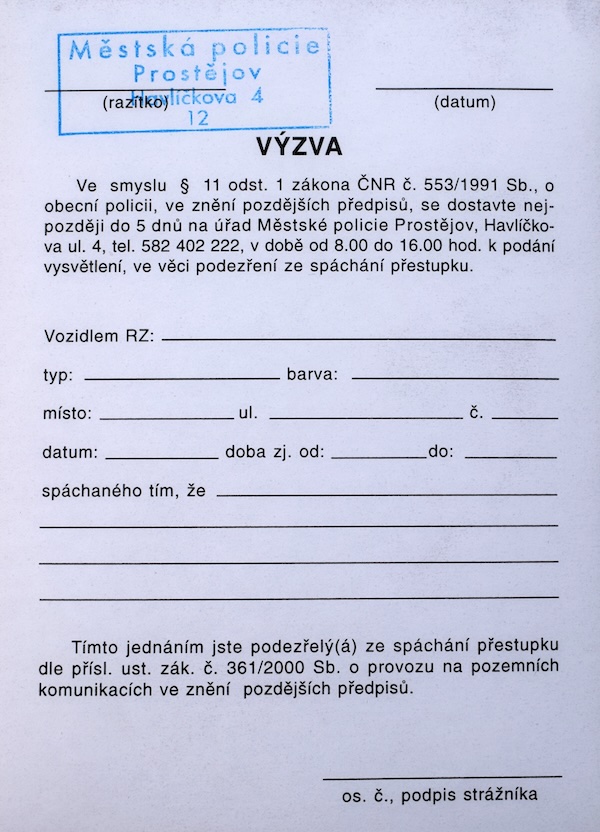 Na začátku týdne přišel na služebnu Městské policie Prostějov na Havlíčkově ulici řidič, který přinesl výzvu k zaplacení částky 500 korun za špatné parkování. Tuto našel na svém zaparkovaném autě. Strážníci hned poznali, že se jedná o podvod a muže ujistili, aby nikam požadovanou částku neposílal. „V žádném případě se nejedná o výzvu Městské policie Prostějov. Ta má zcela odlišný obsah a samozřejmě razítko dané instituce,“ upozornila mluvčí Městské policie Prostějov Tereza Greplová. Ta upozorňuje další řidiče, aby nic neplatili v případě, že by se setkali s falešnou výzvou a vše oznámili na Policii ČR nebo na Městskou Policii Prostějov.