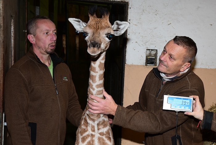 V pátek 20. prosince proběhlo první oficiální vážení a měření narozeného samečka žirafy. Na svět se podíval 11. prosince a o devět dnů později váha a míra ukázaly 39,8 kilogramů a 170 centimetrů. „Prospívá velice dobře, pije od matky, takže je v této chvíli vše v naprostém pořádku,“ vysvětlil Pavel Vidlář.