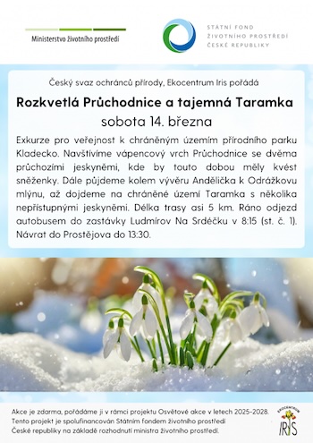 Co: Exkurze pro veřejnost k chráněným územím přírodního parku Kladecko. Navštívíte vápencový vrch Průchodnice se dvěma průchozími jeskyněmi, kde by touto dobou měly kvést sněženky. Dále půjdete kolem vývěru Andělička k Odrážkovu mlýnu, až dojdete na chráněné území Taramka s několika nepřístupnými jeskyněmi. Délka trasy asi 5 kilometrů.