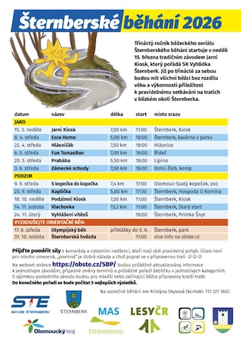 Co: Již po třinácté za sebou budou mít všichni běžci bez rozdílu věku a výkonnosti příležitost k pravidelnému setkávání na tratích v blízkém okolí Šternberka. Bližší informace k jednotlivým závodům najdete na přiloženém plakátu.