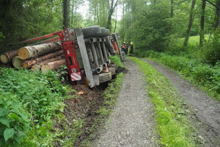 Kamion naložený kládami se v lese převrátil, řidič skončil v nemocnici