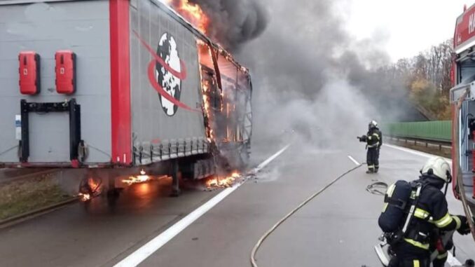 Profesionální hasiči z Hradce Králové a dobrovolní z Chlumce nad Cidlinou v pondělí 3. listopadu na 71,2 kilometru dálnice D11 směrem na Prahu hasili požár návěsu tahače se zbožím. „Řidič nákladní soupravy si během jízdy všiml kouře od zadní části návěsu a po neúspěšném pokusu o uhašení pneumatiky hasícím přístrojem duchapřítomně odpojil tahač, čímž zabránil rozšíření požáru na celou soupravu. Po příjezdu hasičských jednotek byl návěs již celý zasažen plameny, které byly viditelné z dálky. Na návěsu bylo přepravováno zboží v balících,“ objasnila na Facebooku mluvčí hasičů Vendula Horáková. Po uhašení plamenů ochlazovali konstrukci a na místo přijela asistenční služba, která začala překládat náklad.