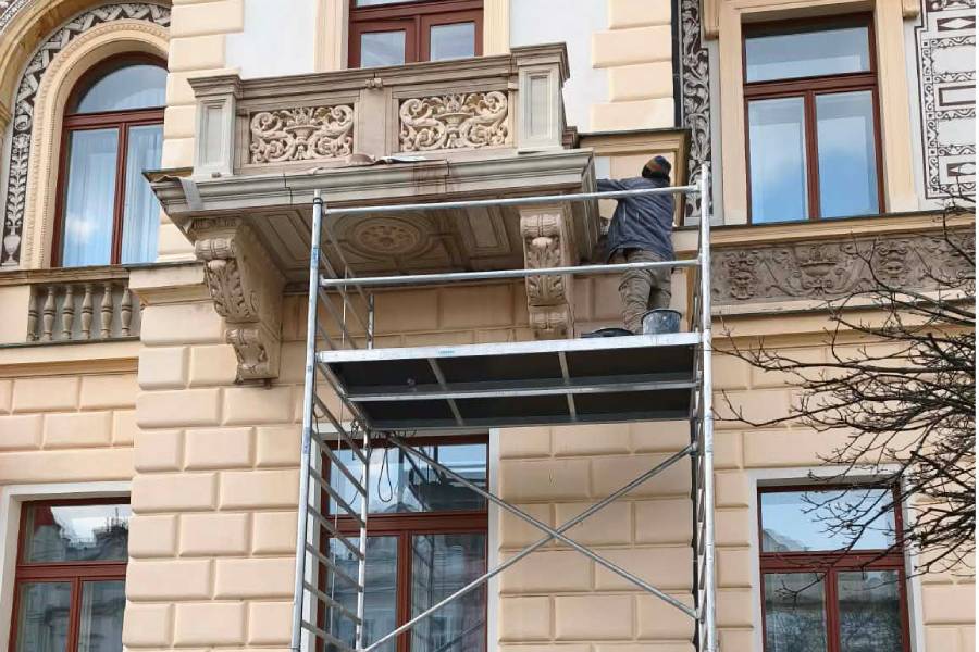 Původní a obnovené zůstaly konzole a dekorativní prvky jako rozety a vejcovce. Restaurátoři museli postupovat velmi precizně – poškozené části bylo nutné slepit, proinjektovat a doplnit románským tmelem. Zachovány a obnoveny byly také konzole a dekorativní prvky, včetně rozet a vejcovců. Po navrácení balkonů ještě pracovníci zapraví fasádní omítky a brzy bude radnice z roku 1894 zářit s novými ozdobenými balkony.