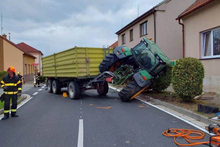 V Sezemicích se převrátil traktor s přívěsem