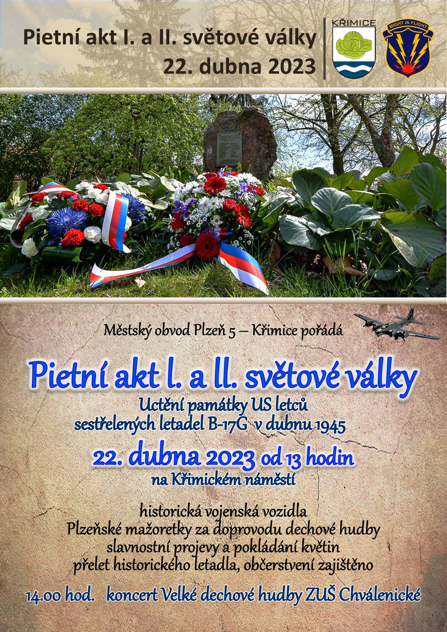 Pietní akt věnovaný obětem světových válek se letos uskuteční v sobotu 22. dubna 2023 od 13:00 hodin na Křimickém náměstí. I letos se mimo jiné můžete těšit na konvoj historických vozidel a techniky, na dechovku, mažoretky, přelet historického letadla, ale samozřejmě i na vojenský guláš.