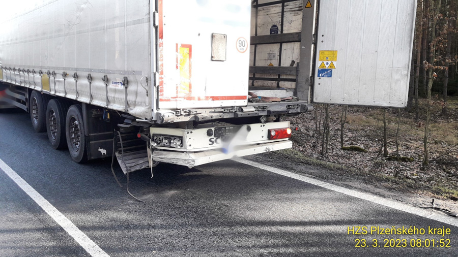 Řidič (1973) dodávky Ford Transit, který jel ve směru od Plzně na Kaznějov, bohužel nedodržel bezpečnou vzdálenost za náklaďákem Daf, který řídil řidič (2000). Ten náhle začal zpomalovat v důsledku dopravní situace před ním a došlo k nepříjemnému střetu. „Řidič a s spolujedoucí(2002) z dodávky byli převezeni k lékařskému ošetření. Alkohol byl u řidičů vyloučen dechovou zkouškou. Komunikace je v místě dopravní nehody průjezdná kyvadlově. Přesnou příčinou a veškerými okolnostmi se zabývají dopravní policisté z územního odboru Plzeň venkov,“ uvedla mluvčí policie Eva Červenková. „Spolujezdce z dodávky jsme vyprostili pomocí hydraulického náčiní. Společně s řidičem byli předáni zdravotní záchranné službě. Komunikace bude uzavřena delší dobu. Nehoda blokuje provoz,“ dodal mluvčí hasičů Petre Poncar. „Z místa nehody záchranáři transportují muže ročník 1973 a 2002 oba se středně těžkými zraněními při vědomí na akutní příjem Fn-Lochotín,“ doplnila informace mluvčí záchranářů Mária Svobodová.