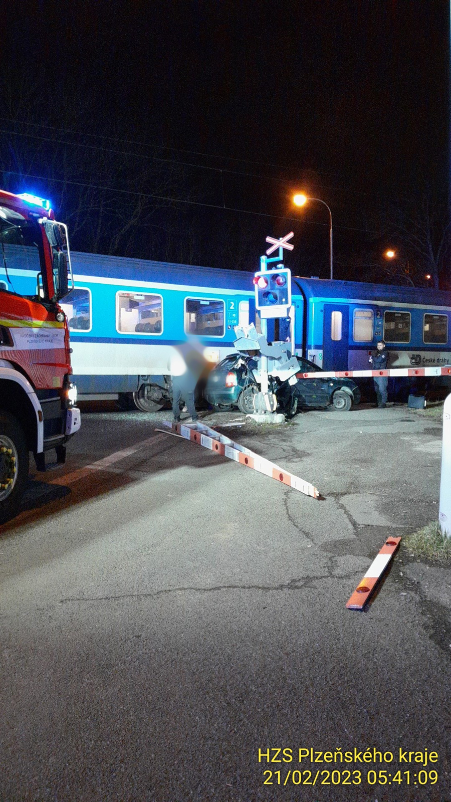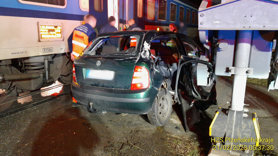 Došlo tam ke střetu vlaku s osobním autem. „Provoz na trati je zastaven. Evakuace cestujících z vlaku nebyla prozatím nutná. Provedli jsme protipožární opatření. Bez úniku provozních kapalin. Nehoda se naštěstí obešla bez zranění,“ sdělil mluvčí hasičů Petr Poncar. „Událost si převzala jednotka Správy železnic,“ dodal.