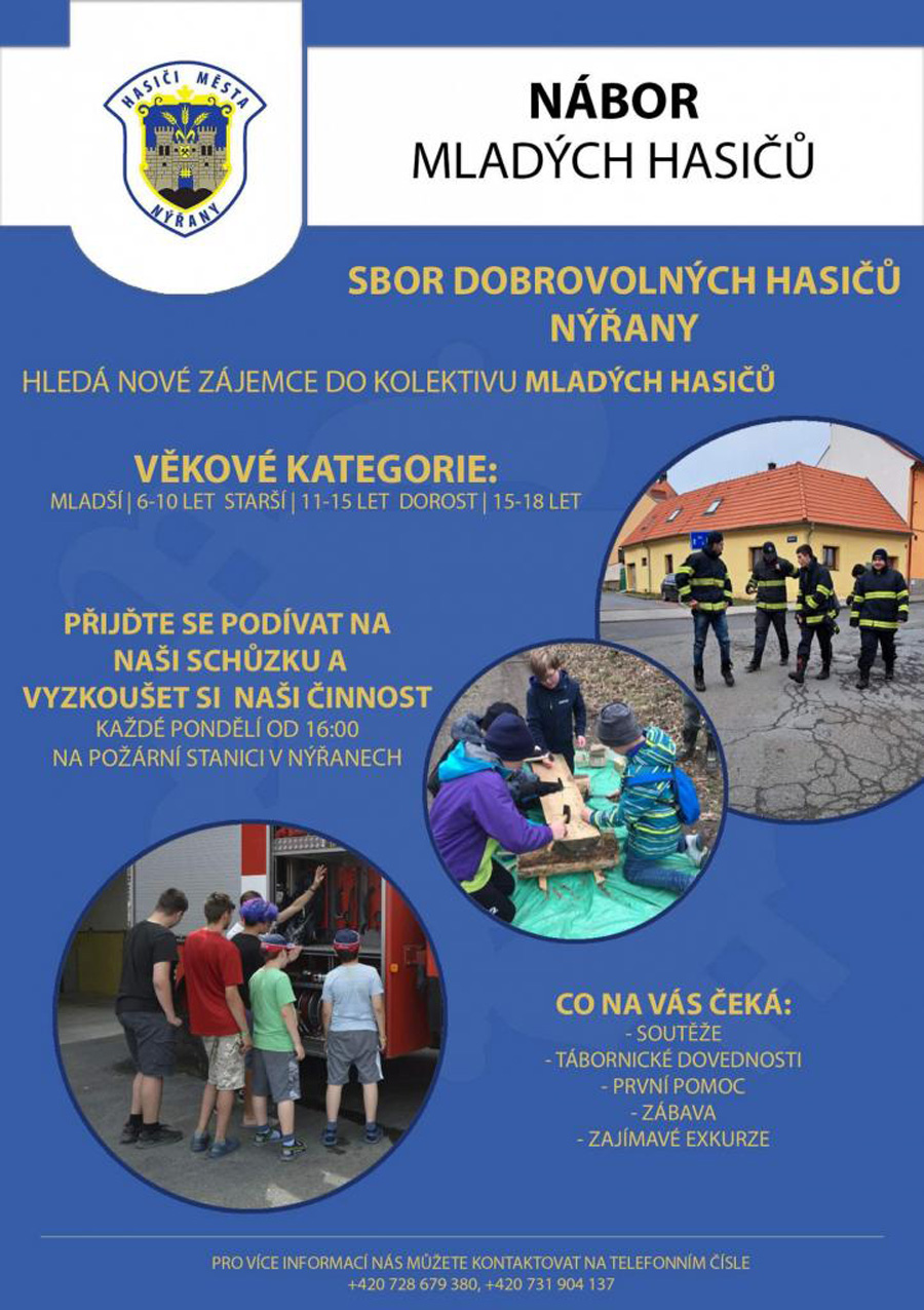 Čekají na ně soutěže, tábornické dovednosti, naučí se dávat první pomoc, podniknou zajímavé exkurze, a hlavně zažijí spousty zábavy. „Přijďte se podívat na schůzku mladých hasičů a vyzkoušet si jejich činnost – každé pondělí na požární stanici v Nýřanech. Pro více informací kontaktujte telefonní číslo 728 679 380 nebo 731 904 137,“ informuje server města Nýřany.