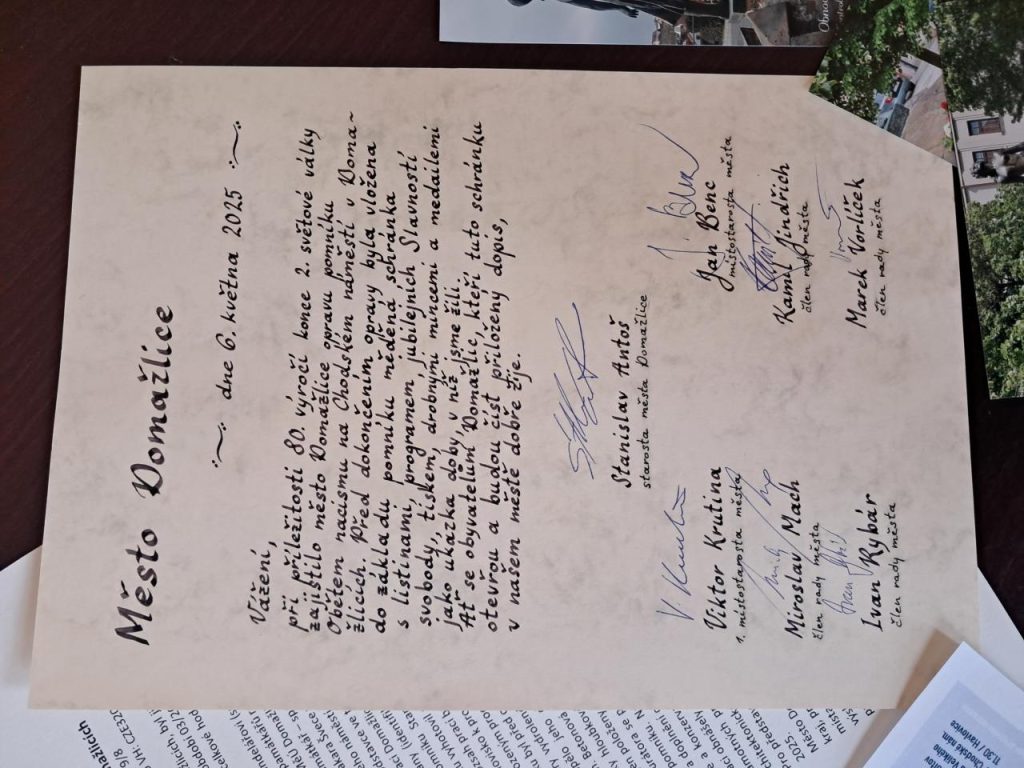 Jedním z výrazných momentů rekonstrukce bylo vložení kovové schránky do podstavce pomníku. Uvnitř je dopis budoucím generacím, platné i pamětní mince, fotografie, informace o opravě a také pozvánka na letošní Oslavy svobody. Schránku připravil umělecký kovář Jiří Oplt.