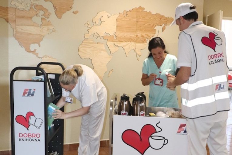 Nemocniční vozík tentokrát nevezl léky ani obvazy. Dobrovolníci FN Plzeň od června zpříjemňují pacientům hospitalizaci mobilní kavárnou a knihovnou. Projekt vznikl ve spolupráci s plzeňskou Střední odbornou školou užitého umění a designu a navazuje na téměř dvacetiletou dobrovolnickou tradici. „Myšlenka vznikla ve spolupráci s koordinátorem dobrovolníků FN Plzeň. Malá mobilní kavárnička nabízí pacientům, ale i personálu nemocnice, kávu nebo čaj,“ uvedla náměstkyně pro ošetřovatelskou péči Andrea Mašínová.