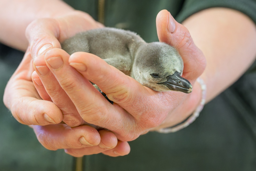 „Rodiče mláděte jsou patnáctiletý samec Dvojtečka a tříletá samice z pražského odchovu, které se přezdívá paní Dvojtečková. Tučňáci totiž tvoří trvalé páry,“ vysvětluje kurátor ptáků Antonín Vaidl. Rodiče se o svého potomka vzorně starají a oba ho krmí natrávenou kaší z mořských ryb. „I přes vzornou péči je nutné mládě pravidelně prohlížet a vážit. Při vylíhnutí mělo hmotnost 80 gramů, pátý den již 138 gramů a vůbec vypadá houževnatě,“ dodává. Chovatelé budou zjišťovat pohlaví ptáka asi za dva měsíce a malý tučňák by se v té době mohl poprvé odvážit do vody. Jeho šedé zbarvení, typické pro mladé jedince, se změní až za více než rok, kdy přepeří do černobílého šatu dospělců.