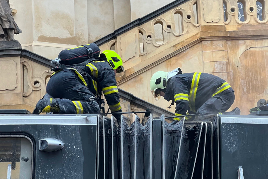 Tramvaj, která měla namířeno na Lehovec, zůstala stát poblíž kostela svatého Jana Nepomuckého Na Skalce. U požáru zasahovali hasiči z pražského Dopravního podniku i profesionální hasiči z centrální stanice. Ti zjistili, že hořet začaly elektrické kabely v tramvaji a požár se rozšířil i do kloubu a podhledu tramvaje. „Bylo nutné vypnout přívod elektřiny a zasahovat kvůli dýmu v dýchací technice,“ upřesňuje mluvčí pražských hasičů Martin Kavka. Hasiči nasadili jeden vodní proud. Příčinou požáru byla technická závada, škoda se podle Dopravního podniku vyšplhala na milion korun.