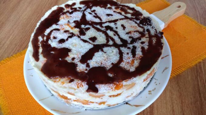 Dortovou formu vyložíme pečicím papírem nebo potravinářskou folií a na ni naskládáme první vrstvu: piškoty, meruňkový krém ze zakysané smetany a kousky mírně uvařených meruněk (můžete je i rozmačkat na pyré) a nakonec posypeme kokosem. Stejně položíme druhou vrstvu, přičemž piškoty dáme plochou stranou nahoru. Povrch namažeme zbytkem krému a posypeme kokosem. Můžeme jemně ozdobit čokoládovou polevou. Necháme odležet v chladnici, minimálně 12 hodin.
