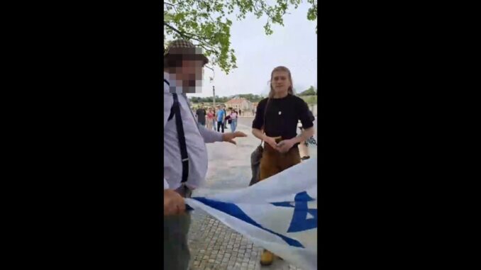 PRAHA – Vlajka Izraele se neznámému muži nelíbila, tak její dřevěnou tyč zlomil vejpůl! Přetahoval se o ní s majitelem na chodníku u Mánesova mostu v neděli 14. dubna, krátce po druhé hodině odpoledne. Policii se ho stále nepovedlo najít, a tak vzývá veřejnost o pomoc.