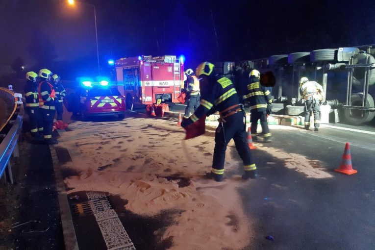 Na sjezdu z Pražského okruhu se nad ránem převrátil kamion. Vytekl z něj jar na nádobí