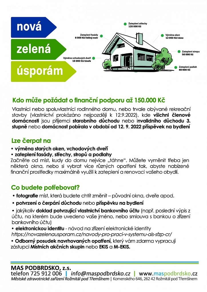 Místní akční skupina (MAS) Podbrdsko nabízí obyvatelům Rožmitálska, Březnicka a Hvožďanska pomoc s žádostí o příspěvek z programu Nová zelená úsporám light. Majitelé domů, chat a chalup mohou získat až 150 tisíc korun. A to například na výměnu oken, dveří, případně zateplení fasády či podlah. Poradenství je zdarma.