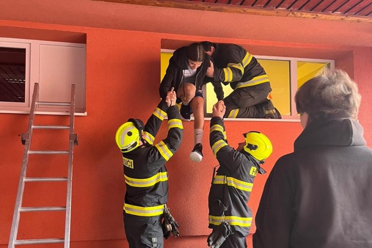 Pro mladé sportovkyně nebyl problém vylézt přes lavici a radiátor do otevřeného okna, kde už na ně čekal jeden z hasičů a pomohl jim protáhnout okenním otvorem. Pak za pomoci dalších dvou hasičů děvčata hbitě seskočila na zem. Ani nebylo nutné použít připravený žebřík.