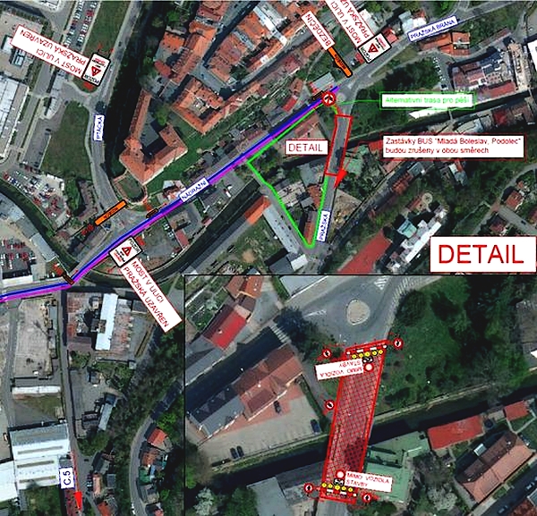 Po dobu rekonstrukce je kruhový objezd v Podolci průjezdný do ulic Nádražní a Vinecká. Odbočení do Pražské ulice směrem nahoru k Hejtmánce není možné. Ve směru z Hejtmánky směrem dolů k mostu dopravní značení upozorňujr na uzavírku mostu.