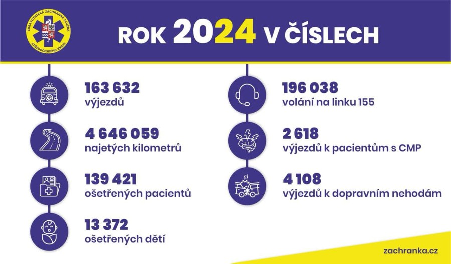Linka 155 zaznamenala za minulý rok 196 038 volání, což je zhruba jeden hovor na každého sedmého obyvatele Středočeského kraje. A ošetřených pacientů? Těch bylo 139 421, z toho více než 13 tisíc dětí. To znamená, že pomoc záchranářů potřeboval za uplynulý rok každý desátý obyvatel kraje.