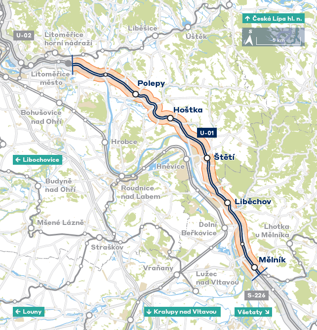 Rekonstrukce se týká úseku mezi Mělníkem a Litoměřicemi dolním nádražím. Podle tiskové mluvčí Správy železnic Nely Eberl Friebové „Rekonstrukcí projde část takzvané pravobřežky v délce téměř 35 kilometrů včetně všech nádraží. Samotné práce by měly začít v roce 2030.“
