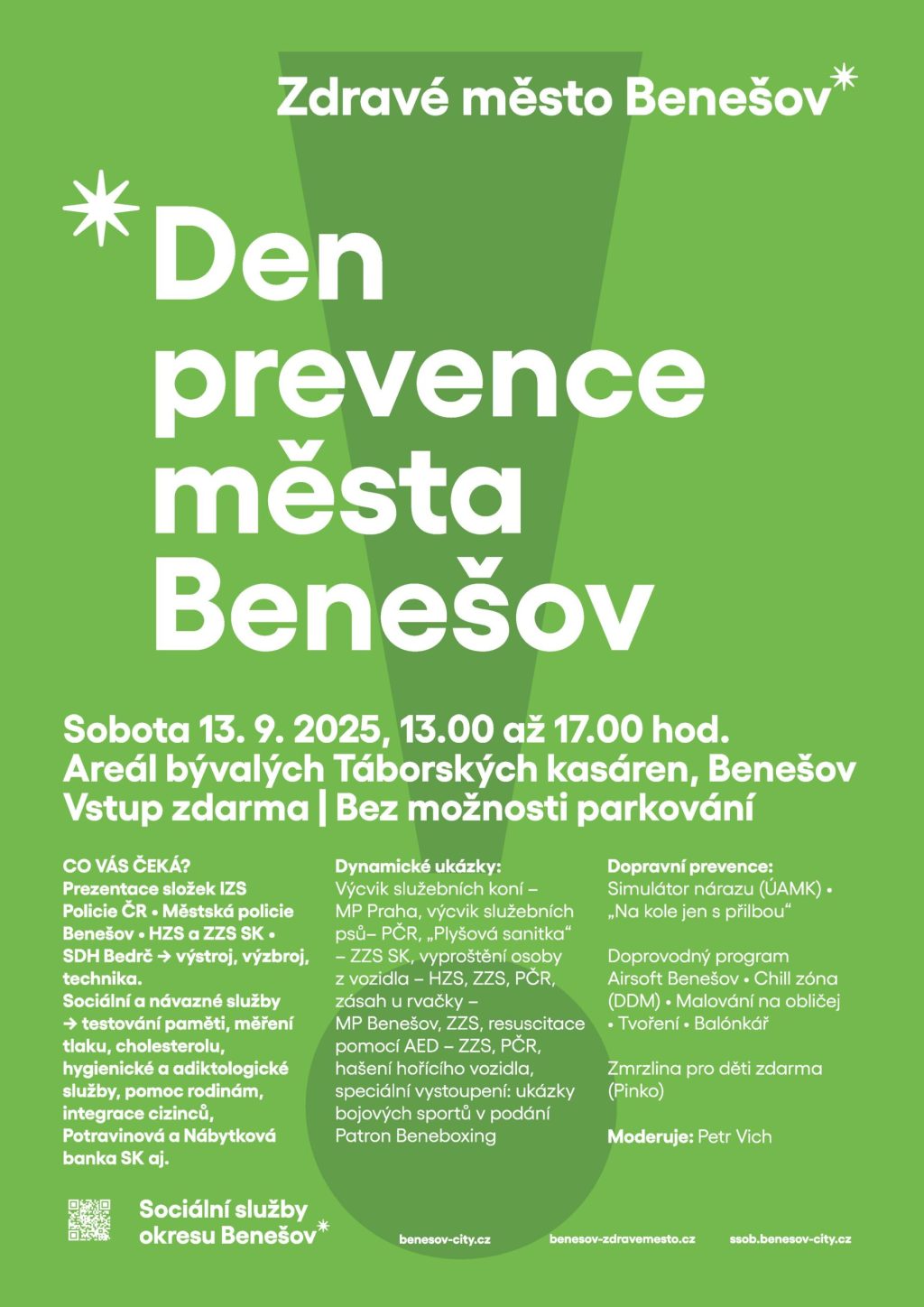 Poprvé se zároveň představí poskytovatelé sociálních a návazných služeb z Benešovska — od podpory seniorů a lidí se zdravotním či duševním onemocněním až po integrační a poradenská centra. Nemocnice Rudolfa a Stefanie a Krajská hygienická stanice nabídnou měření zdravotních hodnot a odborné poradenství. Pro děti jsou připraveny tvořivé dílny, malování na obličej, pletení copánků, chill zóna DDM Benešov a airsoftová střelnice; zubní kartáčky rozdá Herbadent a zmrzlinu zajistí společnost PINKO.