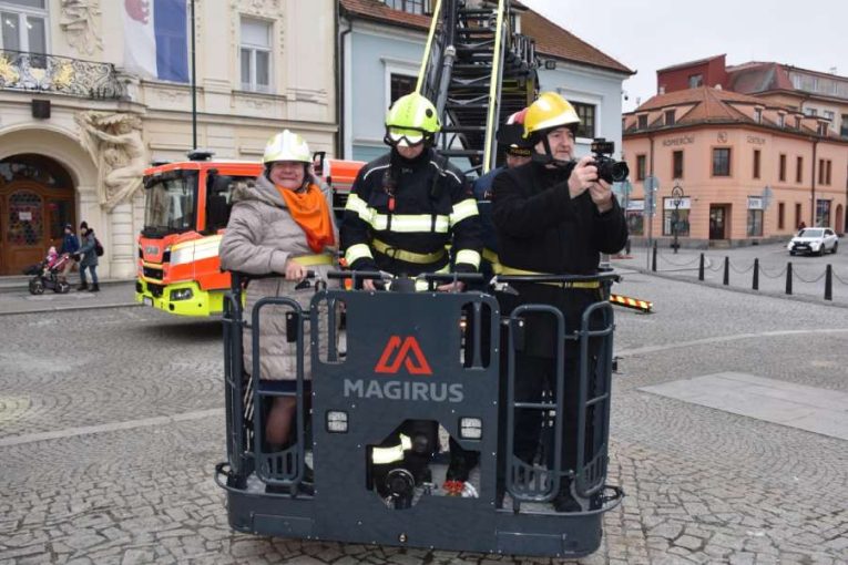 Novou techniku hasiči představili u berounské radnice. Největší pozornost přitahoval automobilový žebřík s dosahem až 42 metrů, který umožní zásahy o tři patra výš než dosavadní technika.
